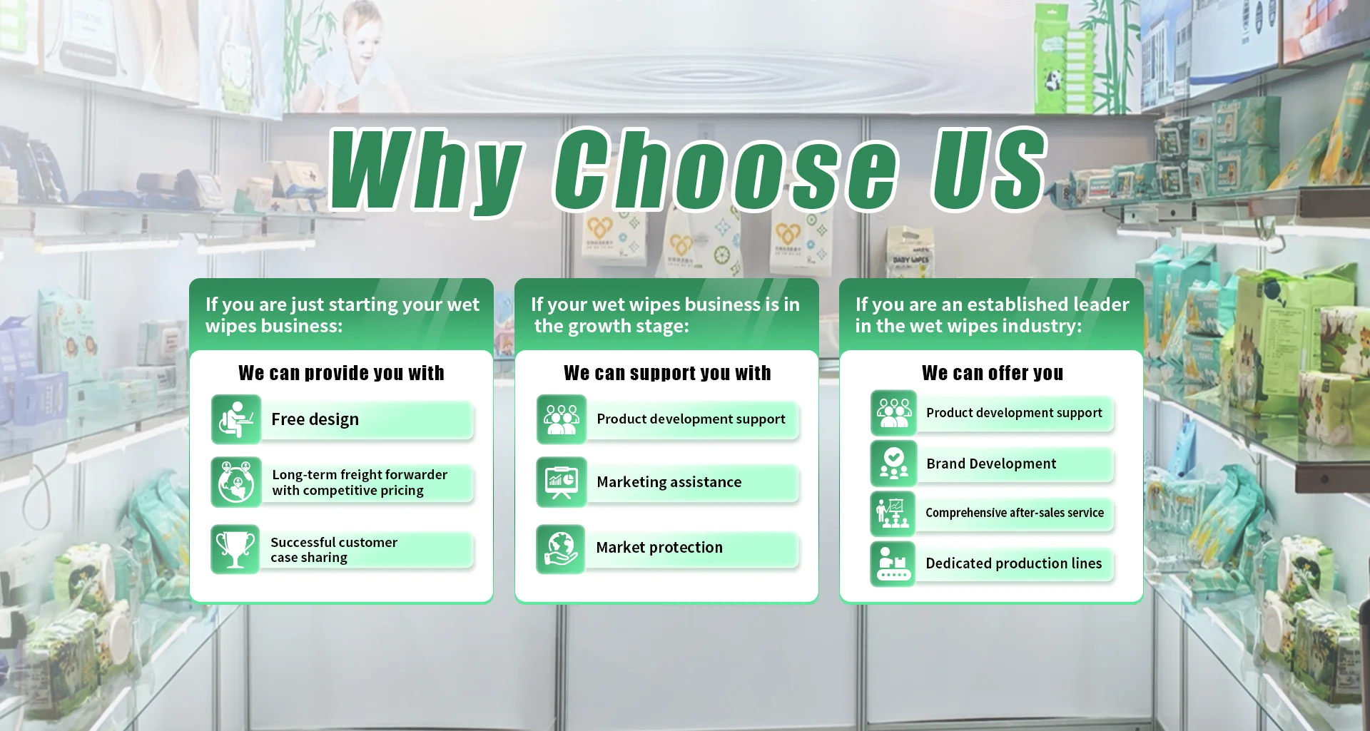 主な製品:ベビーワイプ、抗菌ワイプ、アルコールワイプ、コットンタオル、生分解性ワイプ
